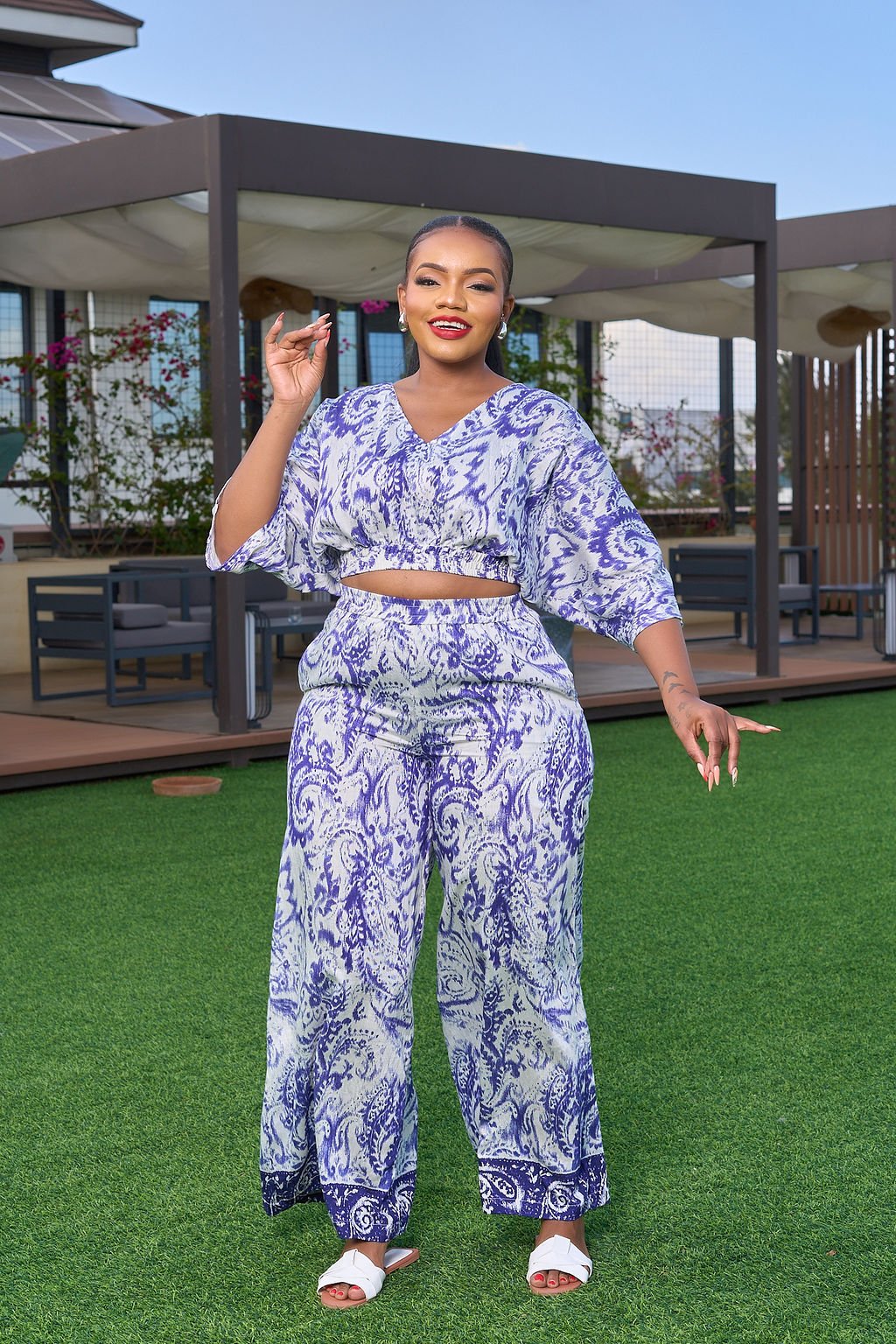 Step out in style with this blue and white printed two-piece set featuring a cropped top and relaxed-fit pants. Lightweight and comfortable, this set is ideal for warm weather, vacations, or casual chic looks. Easy to dress up or down depending on the occasion.