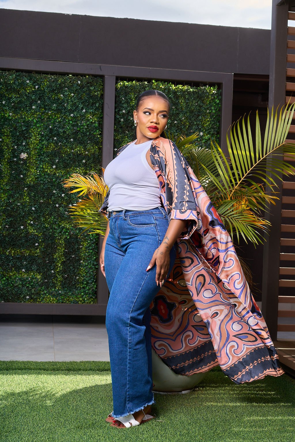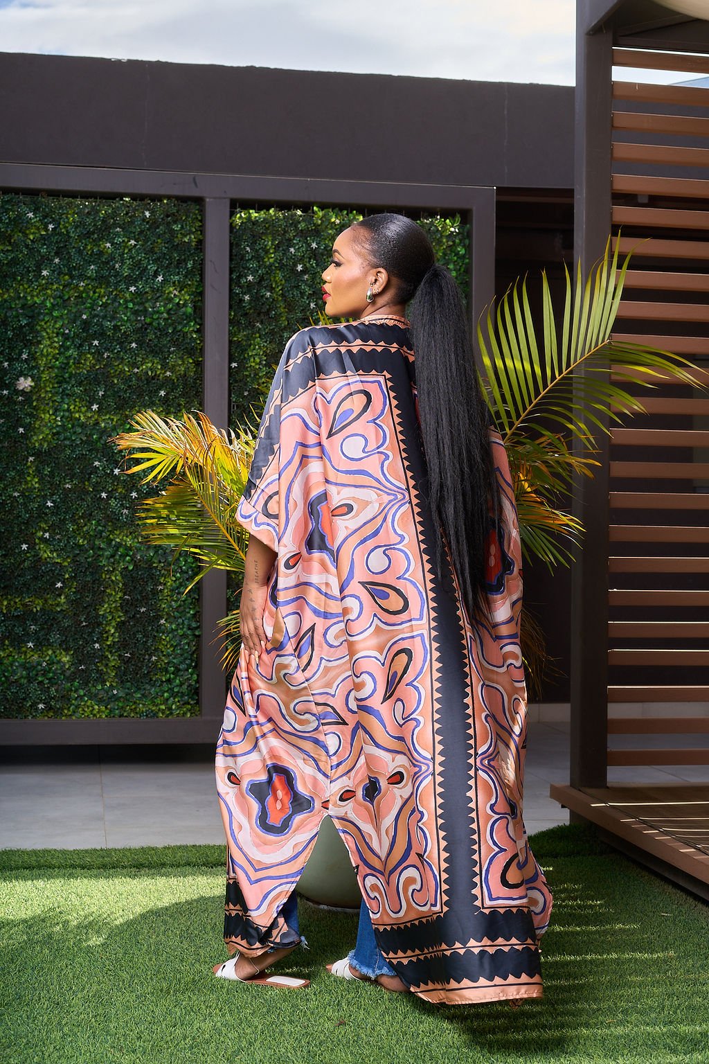 This peach and black abstract print kimono is the ultimate statement layering piece. Featuring a relaxed fit and fluid drape, it’s designed to move effortlessly with you. Perfect for styling over jeans and a basic top, this kimono adds instant depth and style to your look — whether you’re heading to brunch, running errands, or dressing up a casual outfit.