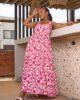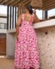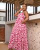 Design & Palette The dress showcases an intricate pink floral pattern that radiates energy and warmth. The multi-tiered skirt adds an architectural depth to the garment, ensuring a dramatic yet lightweight flow with every step. The structured bodice is balanced by a square neckline, providing a timeless frame that is both modest and sophisticated.