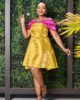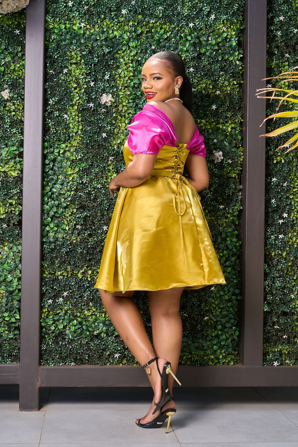 Turn heads in this bold gold satin mini dress designed to flatter and shine. Featuring a structured bodice and a statement fuchsia off-shoulder bow detail, this dress is perfect for brunch dates, birthdays, and festive occasions. The smooth satin finish adds a luxe feel while the playful silhouette keeps it fun and modern. Style with heels for an elevated look or dress it down with flats for daytime chic.