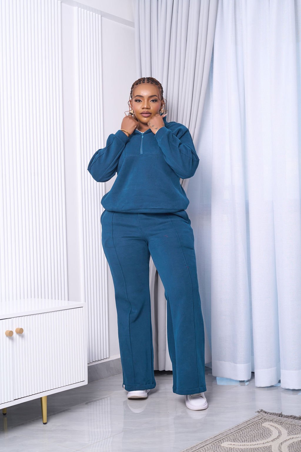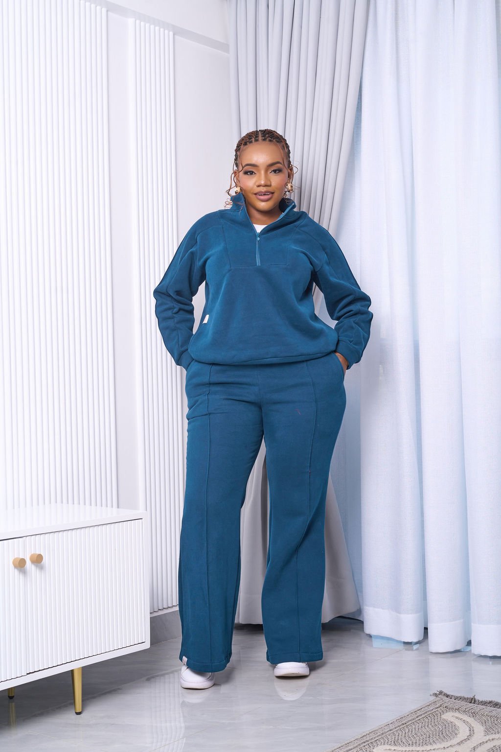 Embrace cozy elegance with Polo Fleece Pants Set in a striking Teal. This set features a high-neck, half-zip pullover and relaxed, wide-leg trousers. Crafted from a soft, plush fleece, it offers warmth without sacrificing style—ideal for cooler Nairobi evenings or a travel day. Key Features: Premium soft-touch fleece, quarter-zip funnel neck, high-rise wide-leg pants. Your new go-to for polished comfort.